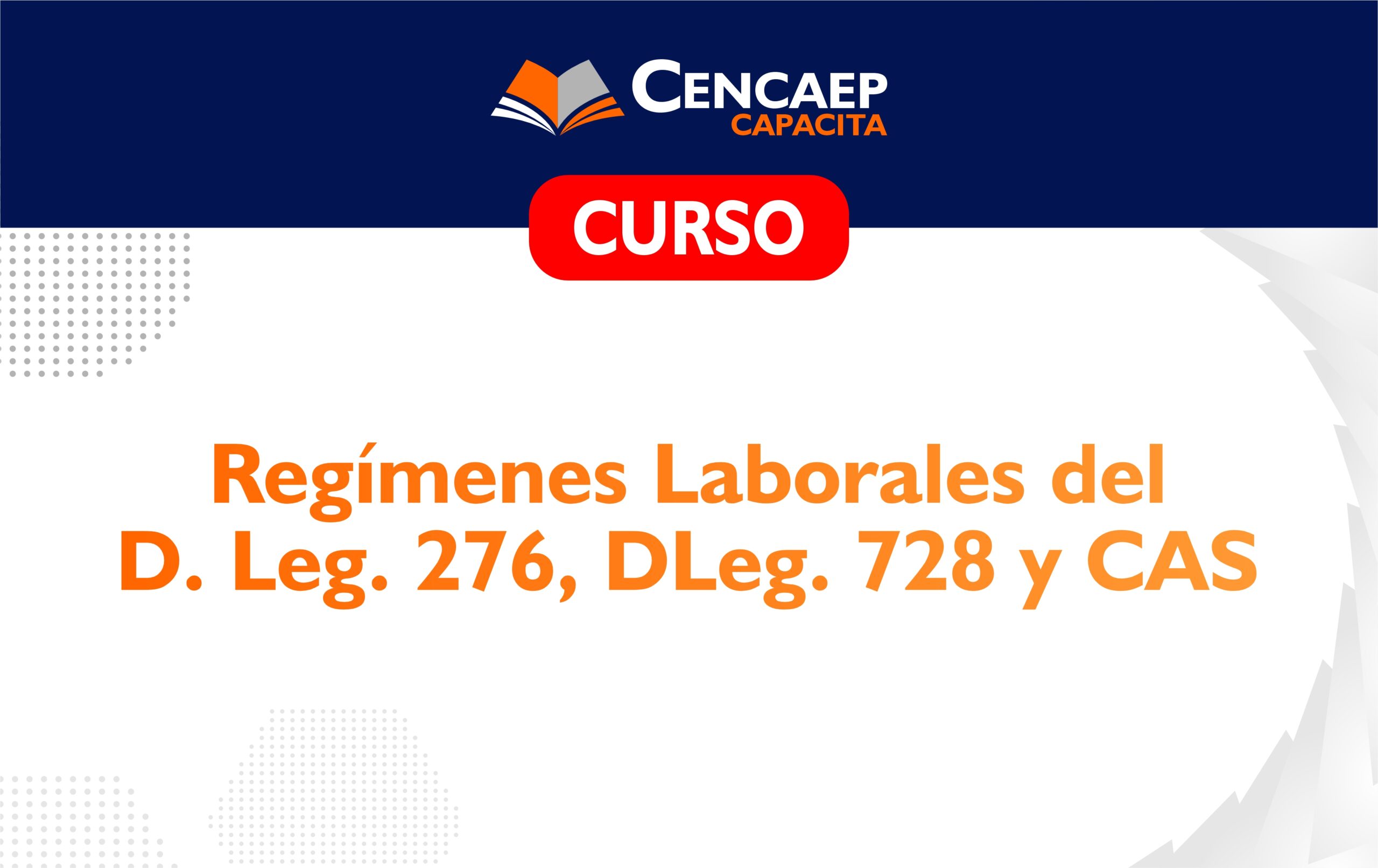 - Brindar a los participantes un conocimiento integral y actualizado sobre los regímenes laborales aplicables en el sector público peruano (D. Leg. N.º 276, D. Leg. N.º 728 y régimen CAS), a fin de que puedan comprender sus características, derechos, obligaciones y diferencias. Asimismo, se busca fortalecer sus capacidades para la adecuada gestión y aplicación normativa en la administración de personal, promoviendo el cumplimiento de la legislación vigente y la toma de decisiones informadas en el ámbito laboral.